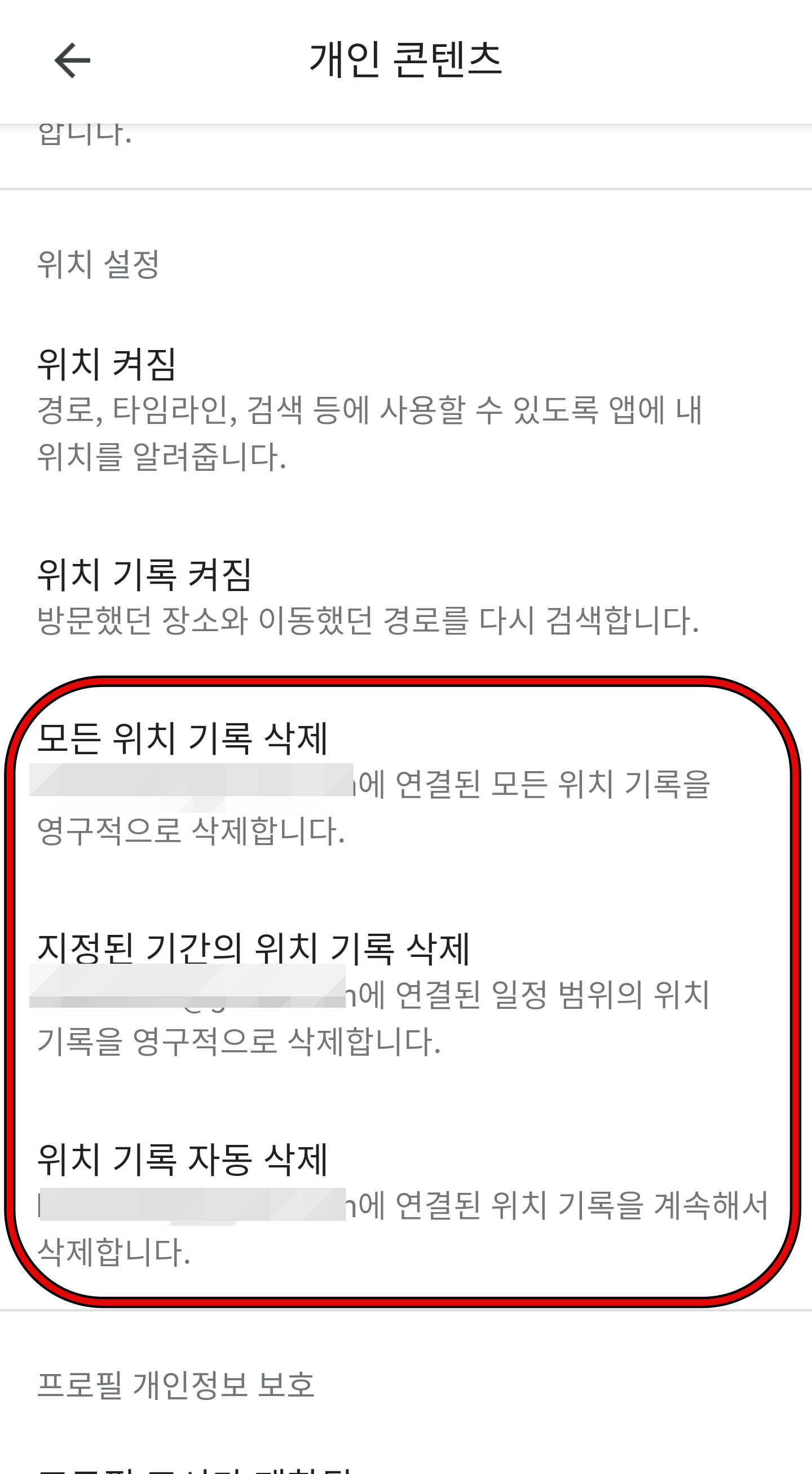 그리고 앞으로 위치기록을 남기지 않을 수 있는 '위치 기록 자동 삭제'가 그것입니다.