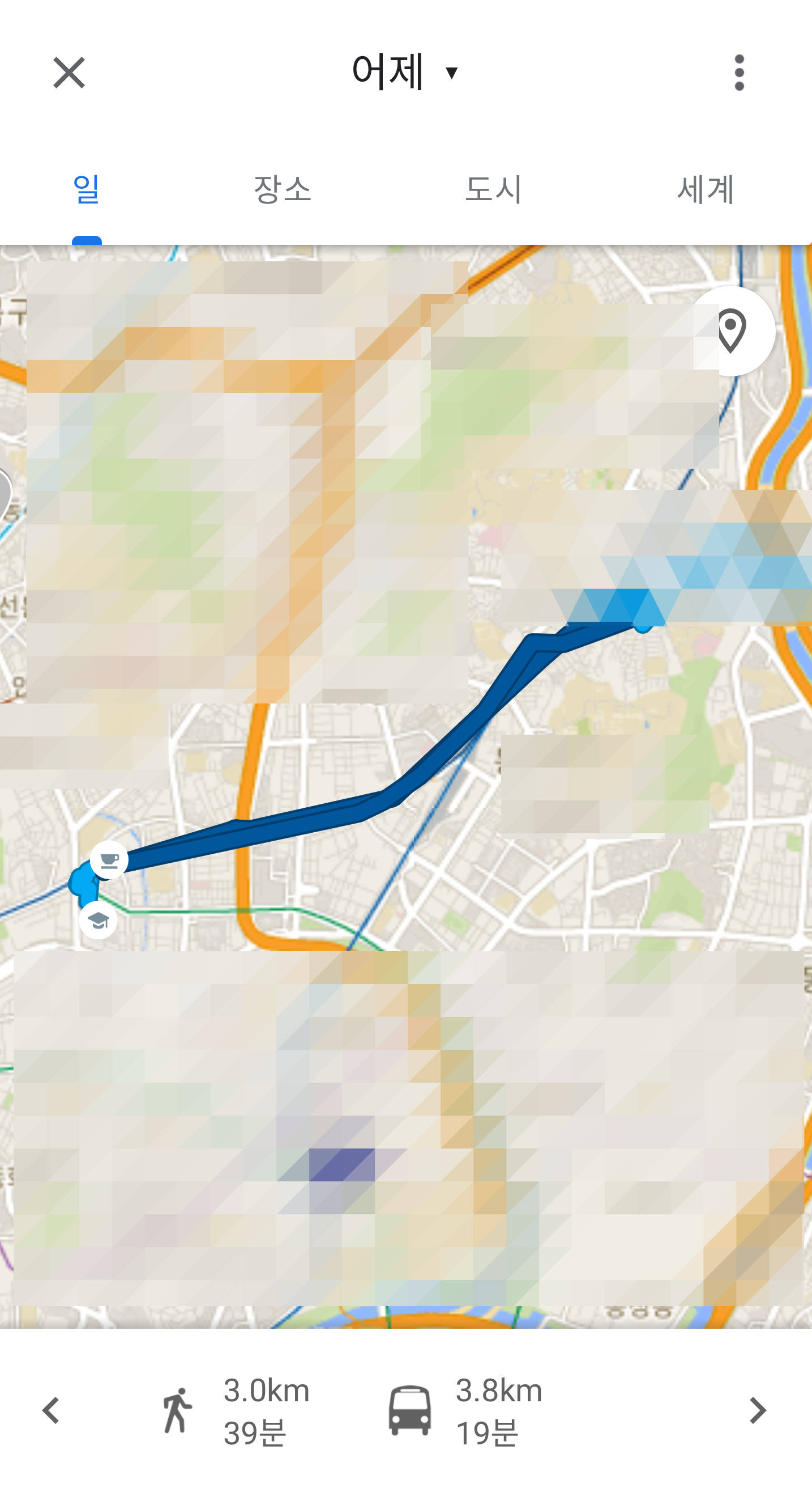 이렇게 제가 어제 지하철을 타고 이동한 곳, 그리고 걸어서 이동한 것이 모두 자세하게 나와있었습니다. 저는 구글 지도를 이용해서 저장해야만 위치 기록이 저장되는 것으로 알았는데 모두 저장이 되어 깜짝 놀랐어요.