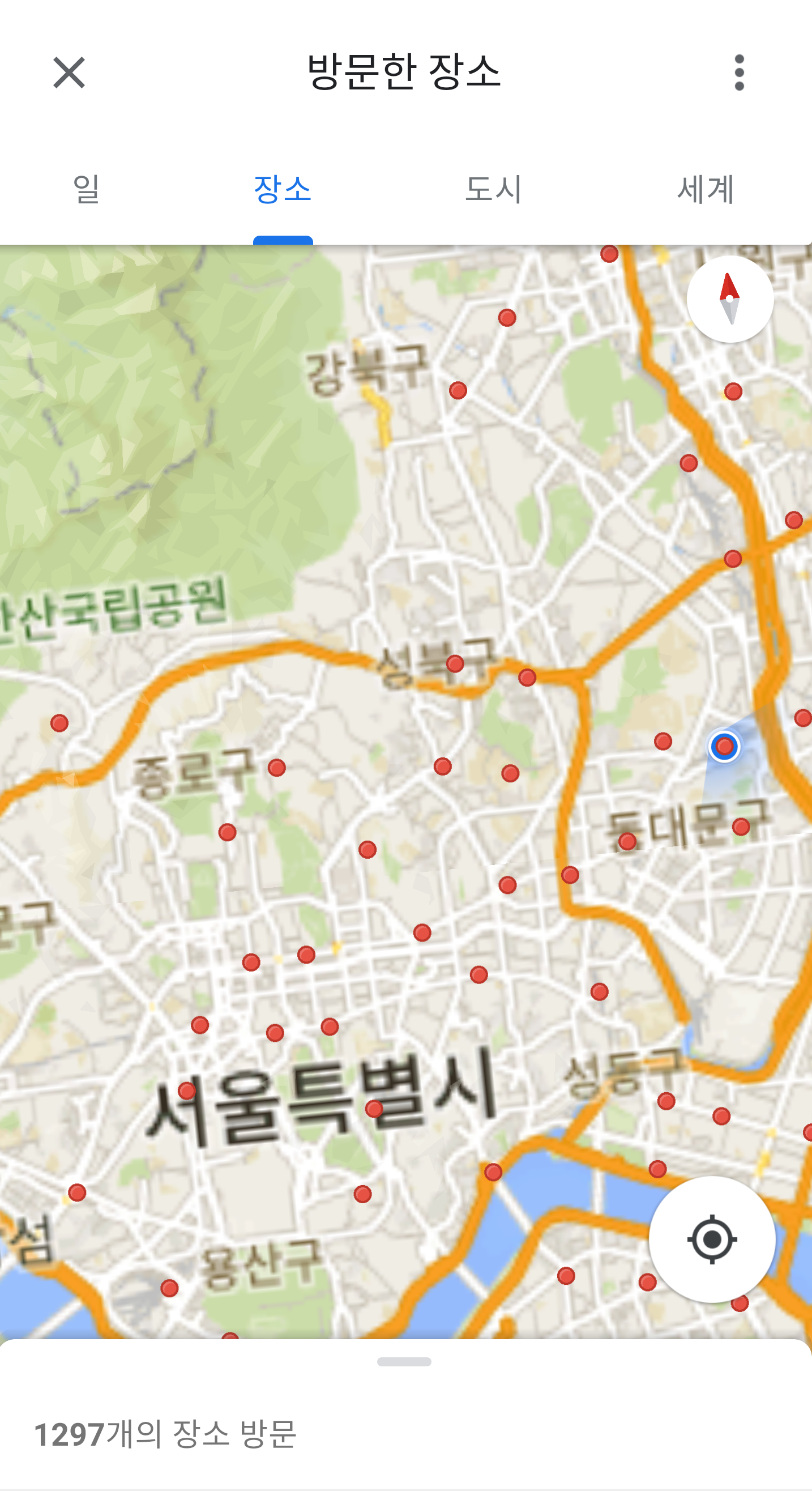 이동한 곳뿐만 아니라 방문한 장소까지 모두! 저장이 되어있었습니다. 이건 제가 서울로 보여드린 것이고, 지방도 물론이고 해외까지 모두 저장이 되어있었어요. 저는 해외여행을 다녀온 곳을 구글 지도에서 따로 추가를 해서 저장을 해놓고는 했는데 그럴 필요가 없다는 것을 알게 되었네요.