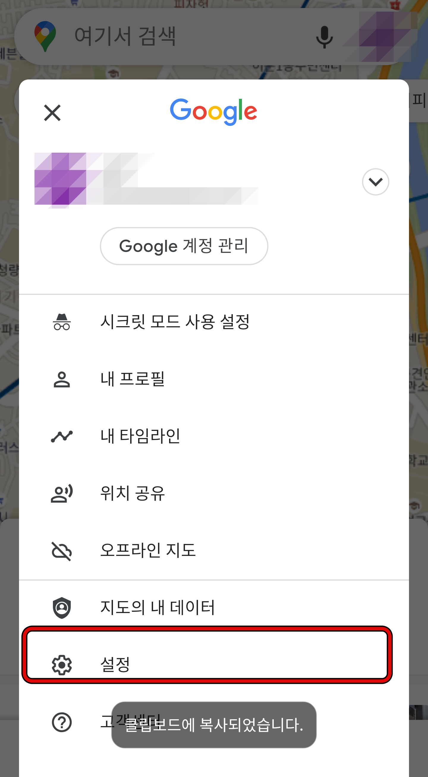 이렇게 프로필을 눌러주시면 아래와 같은 화면이 나오게 됩니다. 친절하게 적혀 있죠? 여기서 "내 타임라인"을 눌러주시면 나의 타임라인이 뜨게 됩니다. 저는 여지껏 구글 지도에 내가 간 곳이 표시되는 기능은 알고 있었지만 타임라인이 이토록 자세하게 기록되고 있는지는 이 포스팅을 작성하면서 처음 알았어요.