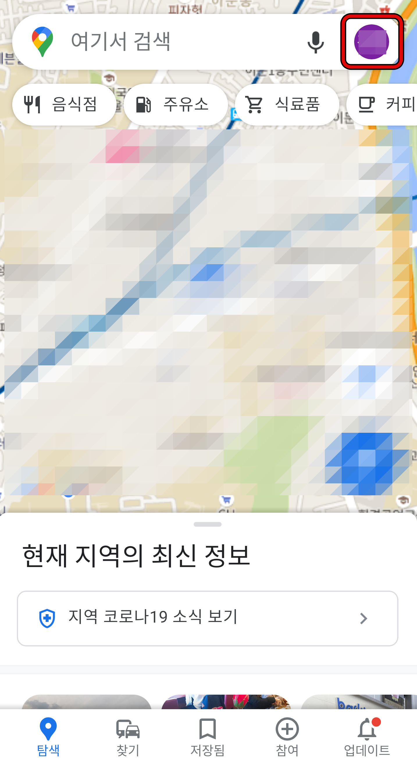 먼저 스마트폰 구글 폴더를 열어주시면 이렇게 지도가 나옵니다. 구글 타임라인은 구글 지도에서 함께 사용되기 때문에 구글 지도에서 설정을 할 수 있습니다. 여기서 타임라인을 보시려면 구글 지도를 작동시키신 후 우측 상단 프로필을 클릭해주시면 됩니다.