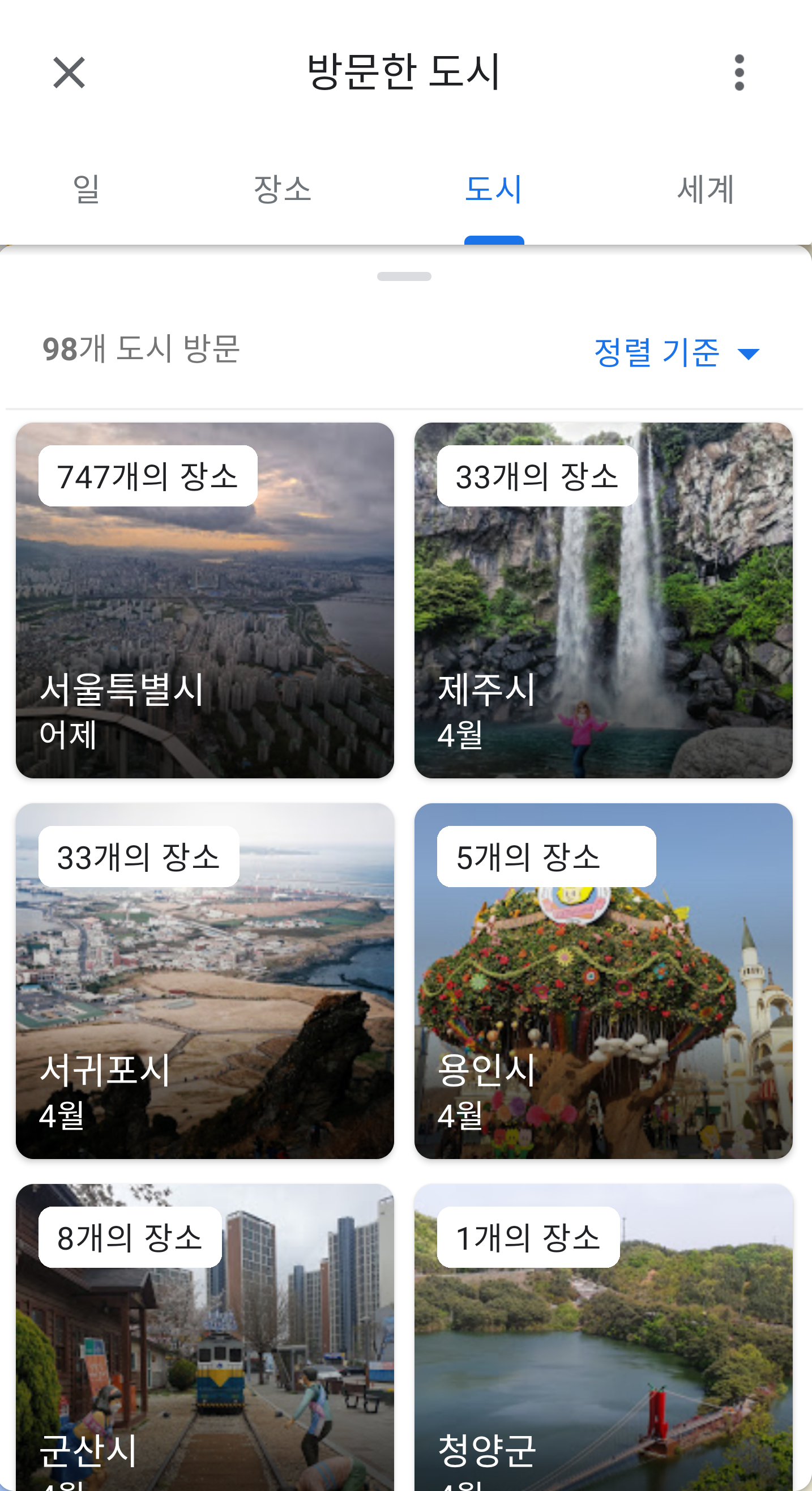 또한 이렇게 방문한 도시들도 모두 나오게 됩니다. 지금까지 방문한 도시들이 모~두 기록이 되어있네요.