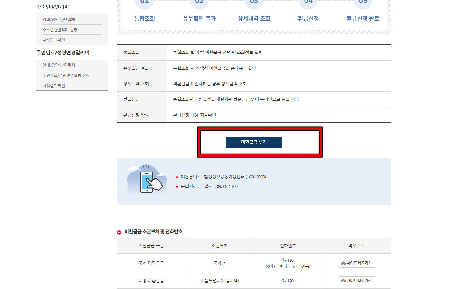 여기서 스크롤을 아래로 내려주시면 바로 미환급금찾기 버튼이 있고 이 버튼을 클릭해주시면 됩니다.