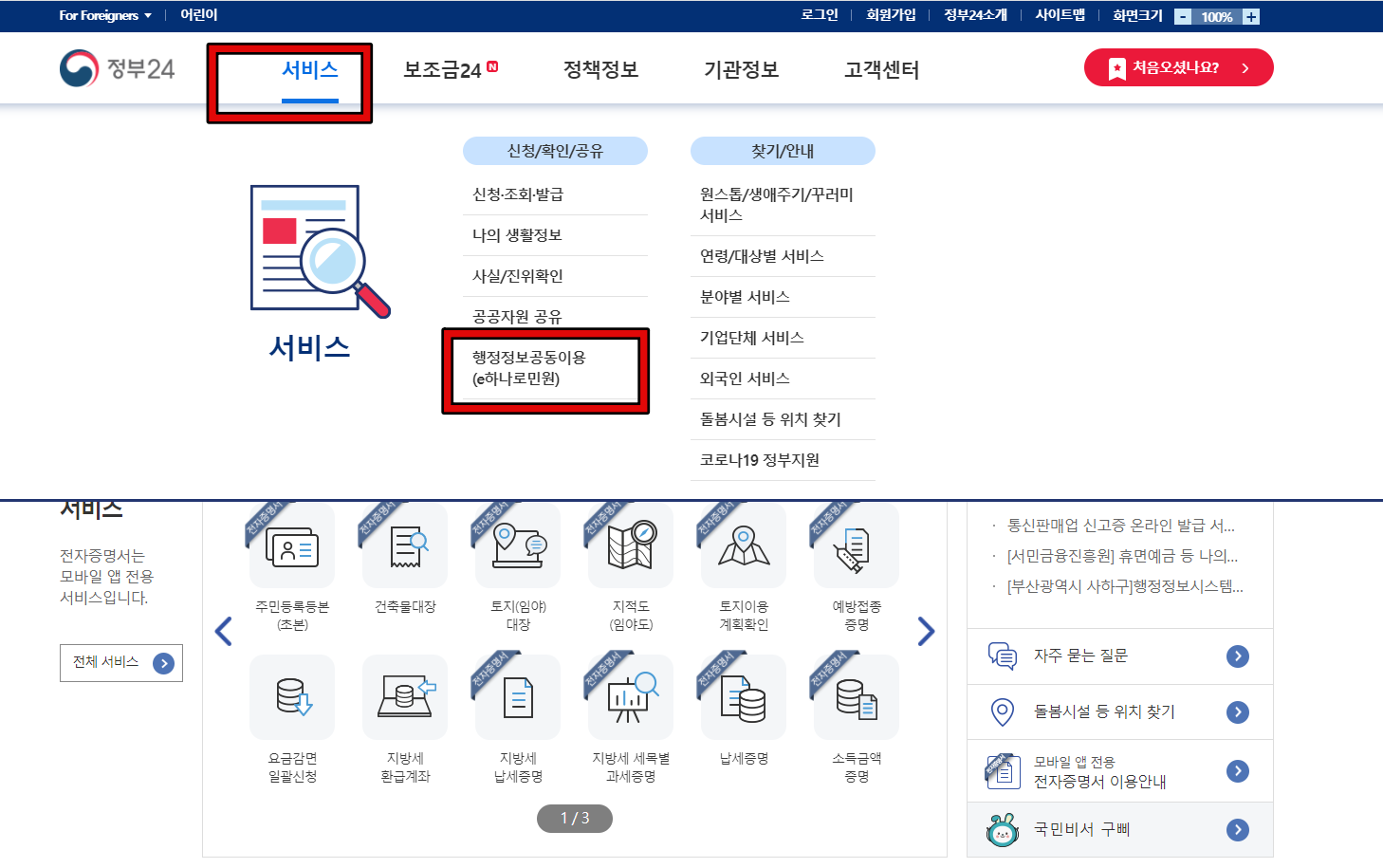 여기서 서비스 항목에서 행정정보 공동이용이라는 카테고리로 들어가 주시면 해당 내용을 확인하실 수가 있습니다. 어렵지 않으시죠?