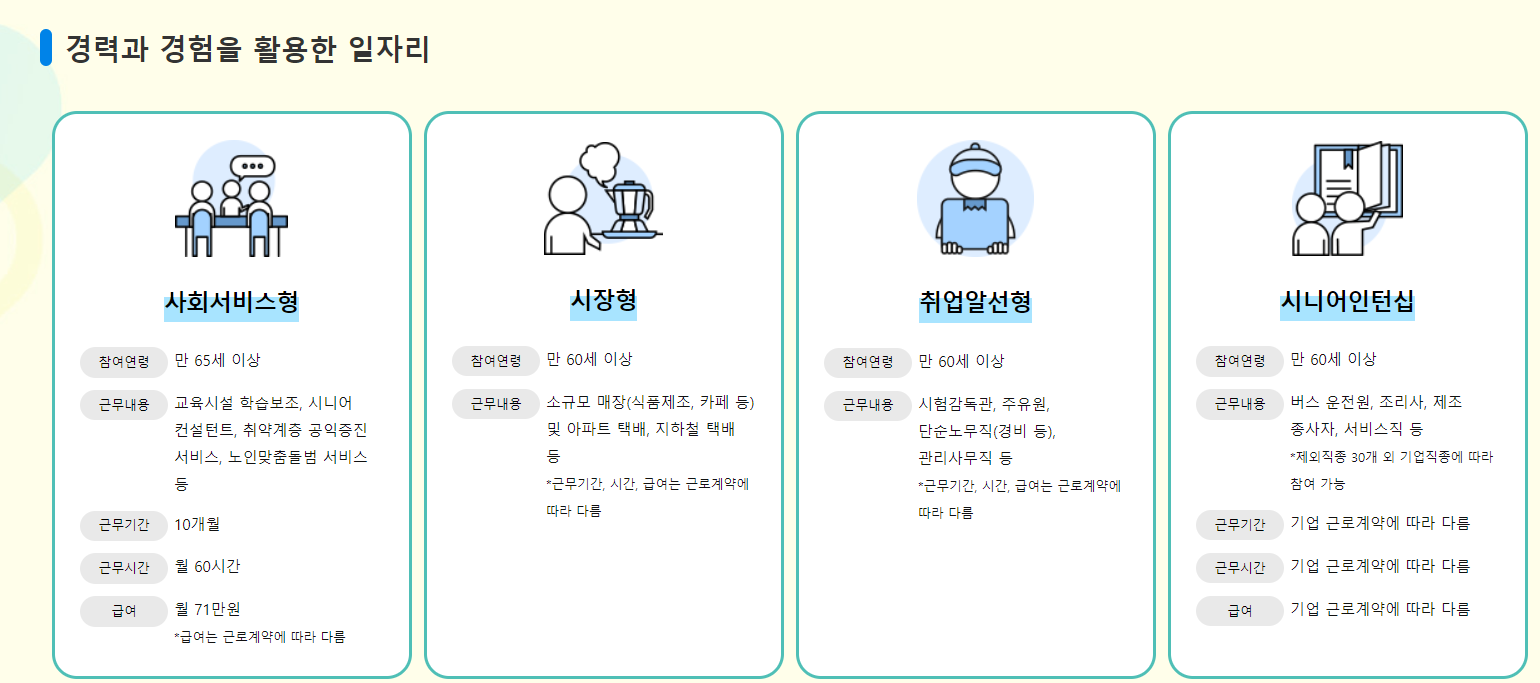 화면에 보이는 시장형과 시니어인턴십 등은 여러유형으로 나뉘어져 있으며 각 유형은 아래와 같습니다.
