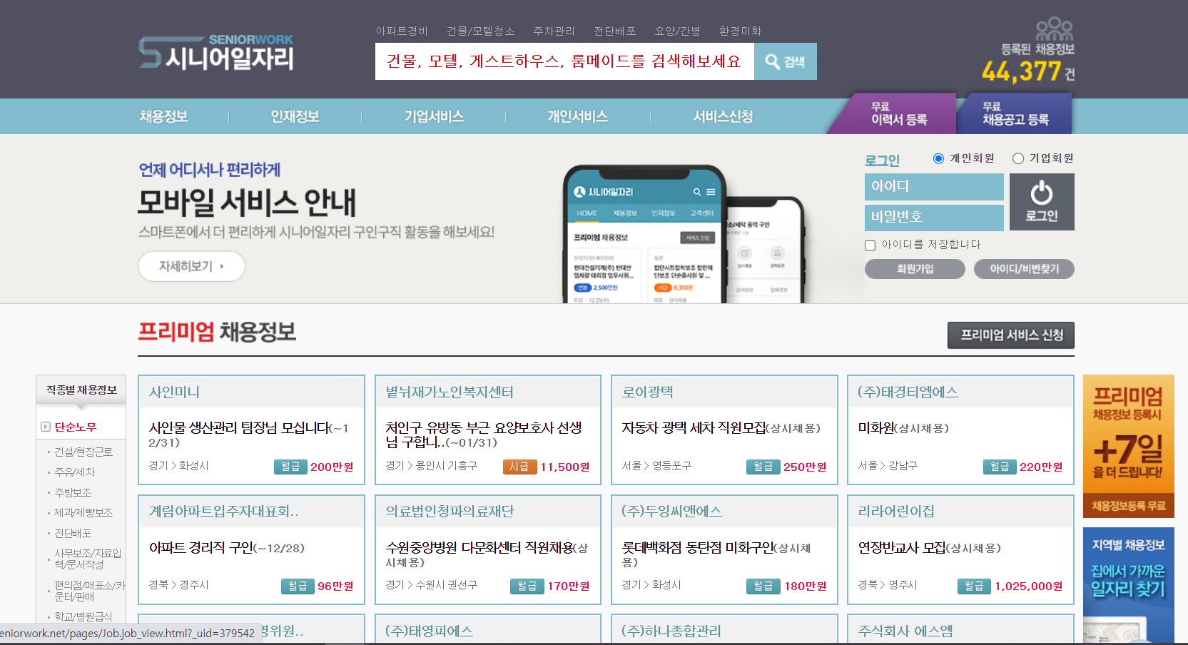 이 사이트에는 좀 더 다양한 일자리들이 등록되어있고, 시급과 월급 등도 한눈에 볼 수 있어 편리 합니다. 일자리는 오늘 기준으로 44,000여개 등록이 되어있다고 나오니, 꽤나 많은 수인 듯합니다.