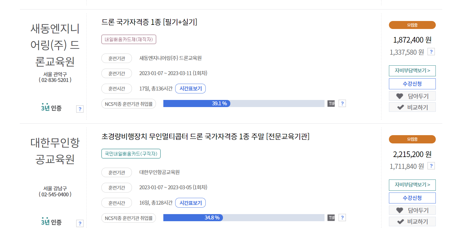 그럼 드론자격증 취득을 위한 학원은 어떤 곳들이 있을까요? 포털에 검색하면 무수한 광고들이 나오지만, 국비지원이 되는 곳은 HRD-Net을 통해 가능합니다.