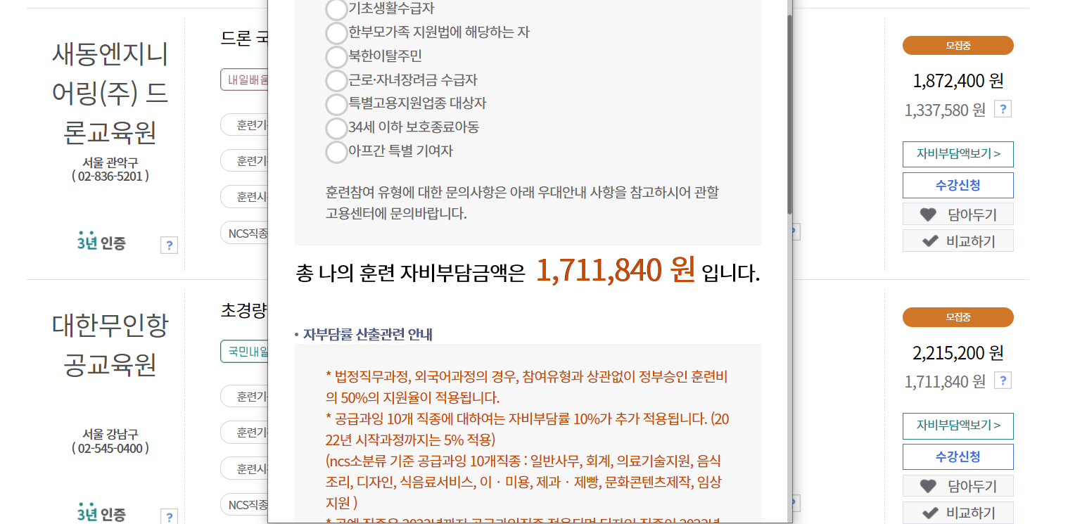 국비지원을 받으면 위 가격에서 물음표 옆 금액이 자비 부담인 것을 알 수 있습니다. 대략 50만원 정도의 국비 지원을 받을 수 있으며, 기초생활수급자나, 고용위기지역 대상자 등은 조금 더 지원을 받을 수 있습니다.