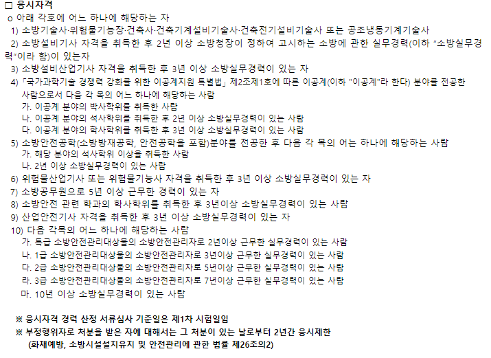 그렇다면 이러한 자격증이 없을 때는 어떤 경우 응시가 가능하냐, 바로 소방관련 실무경력이 10년이상은 되어야 비로소 응시자격이 생깁니다.