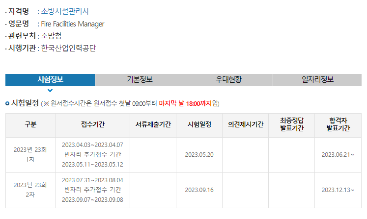 소방시설관리사 시험은 1차와 2차로 나뉘어져있고 둘 다 1년에 한번만 시험을 치르게 됩니다. 이 점부터 상당한 부담이나, 앞서 말씀드린대로 응시자격부터가 쉽지 않습니다.