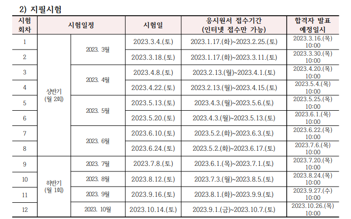2023년 까지는 지필 시험도 함께 진행이 됩니다. 상반기는 월 2회, 하반기는 월 1회이니 상반기에 도전해보는 것이 더욱 좋지 않을까 싶습니다. 4,5월 교육기관에서 교육 받으신 후에 6월 시험에 도전하는게 상반기 취득의 가장 좋은 방향이 아닐까 추천드립니다.