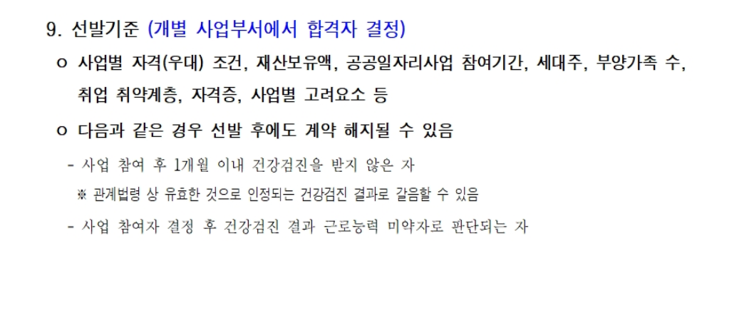 선발기준은 위와 같습니다. 우대조건등이 있고, 여러가지 사업별 고려요소를 판단하여서 선발하게 됩니다. 건강이 좋지 못한 경우에는 선발되었다고 할지라도 계약이 해지될 수 있으니 이 부분 참고하시기 바랍니다.