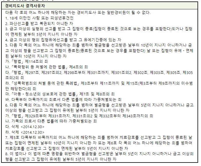 우선 경비지도사 시험에 응시할 수 있는 자격을 알아보도록 하겠습니다. 응시자격은 기본적으로는 제한이 없습니다. 하지만 결격사유가 존재하는데요, 보통은 범죄를 저지르지 않았다면 결격사유에 해당이 되지 않는다고 보면 됩니다.