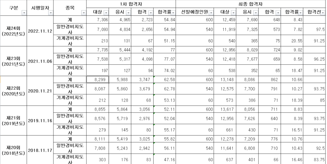 아직 2023년의 시험 결과는 나오지 않아 22년까지의 5개년 시험 합격률을 가지고왔으니 참고 하시기 바랍니다. 일반경비지도사가 우리가 흔히 말하는 경비지도사 입니다.