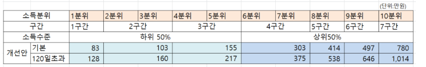 개선안의 기본이 바로 본인이 한달 동안 부담해야하는 비용입니다. 예를 들어 소득 분위 3분위이신 분이 매달 250만원의 병원비를 지출했다면 그 중에 103만원이 본인 부담금이 되는 것입니다. 나머지 147만원은 나라에서 환급해줍니다.