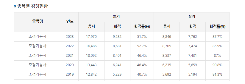 최근 5년내에 30%정도 응시자 수가 증가한 것을 보실 수 있습니다. 이는 비단 조경기능사 뿐만 아니라 다른 자격증들에서도 비슷하게 나타나고 있는 현상이기도 합니다.