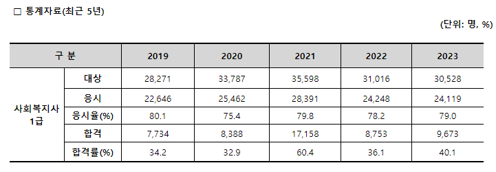 합격률이 아주 높지는 않다는 것도 부담이기는 합니다. 2만4천명이 시험을 보고 그중 9천명 정도가 합격을 하게 됩니다. 코로나 등으로 합격률이 높았던 2021년을 제외 하고는 대체적으로 합격률이 40%를 밑돌고 있다는 점이 난이도가 낮지 않음을 알려주고 있습니다.