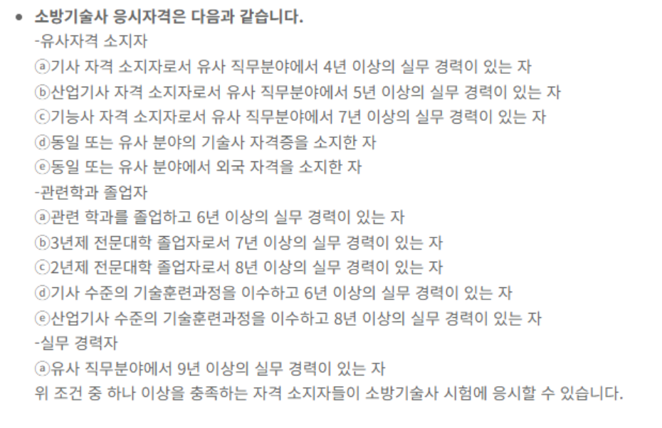 이미 엄청난 진입 장벽이라는 것을 알 수 있습니다. 만약 다른 기사 자격증을 소지하고 있다면 유사 직무 분야에서 4년 이상의 실무 경력을 쌓아야 응시 자격을 얻을 수 있습니다. 즉, 기사 자격증 취득 후에도 최소 4년의 현장 경험을 반드시 요구하는 것입니다.