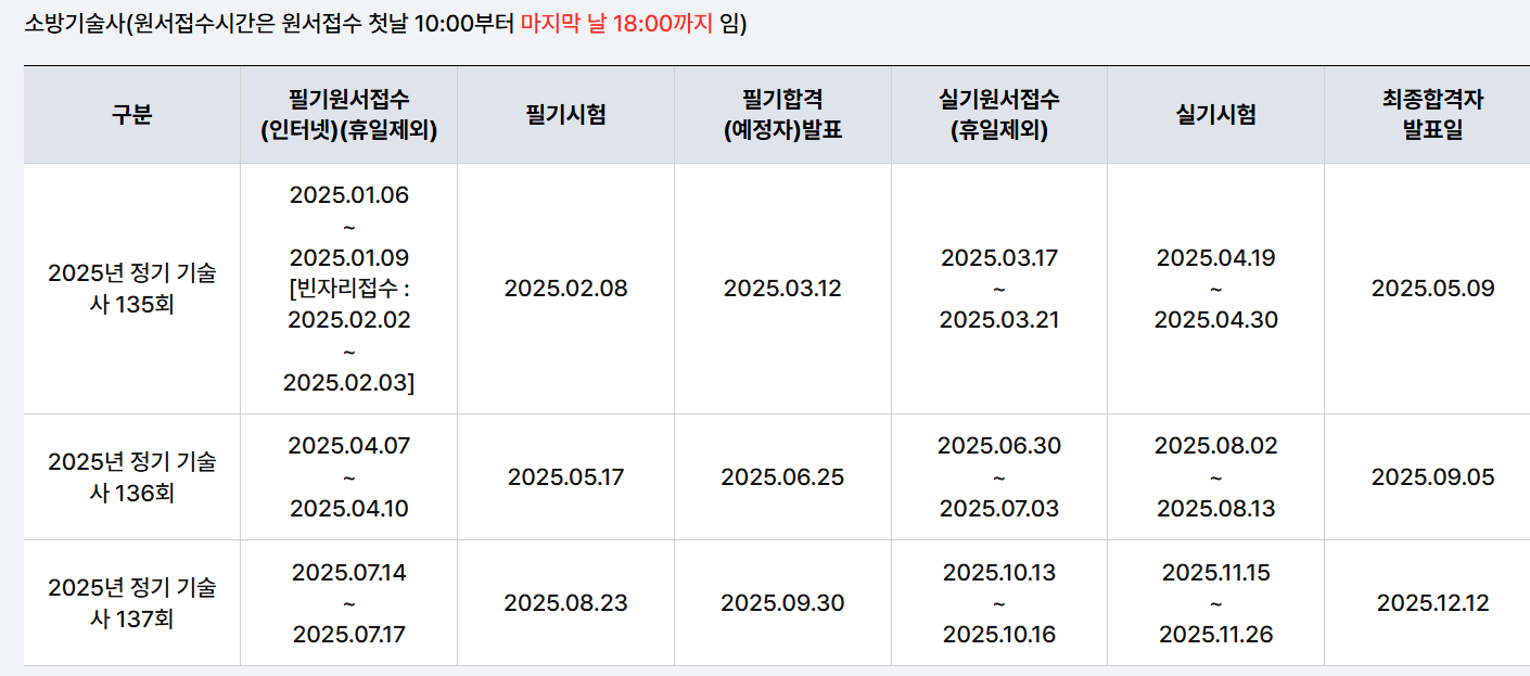 소방기술사 시험은 다른 고난도 시험들과는 달리 연간 여러 차례 시행되는 특징이 있습니다. 2025년도 시험은 현재 확정된 일정 기준으로 총 3회 진행될 예정입니다. 2025년도 일정은 아래와 같습니다.