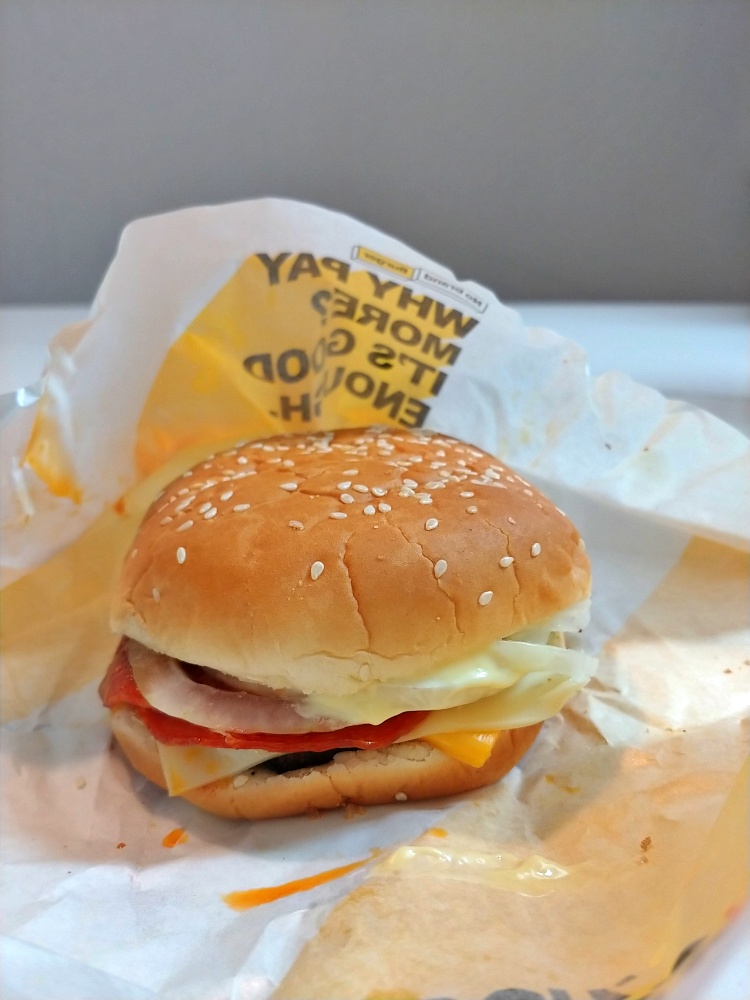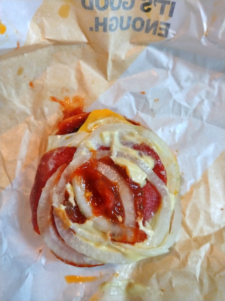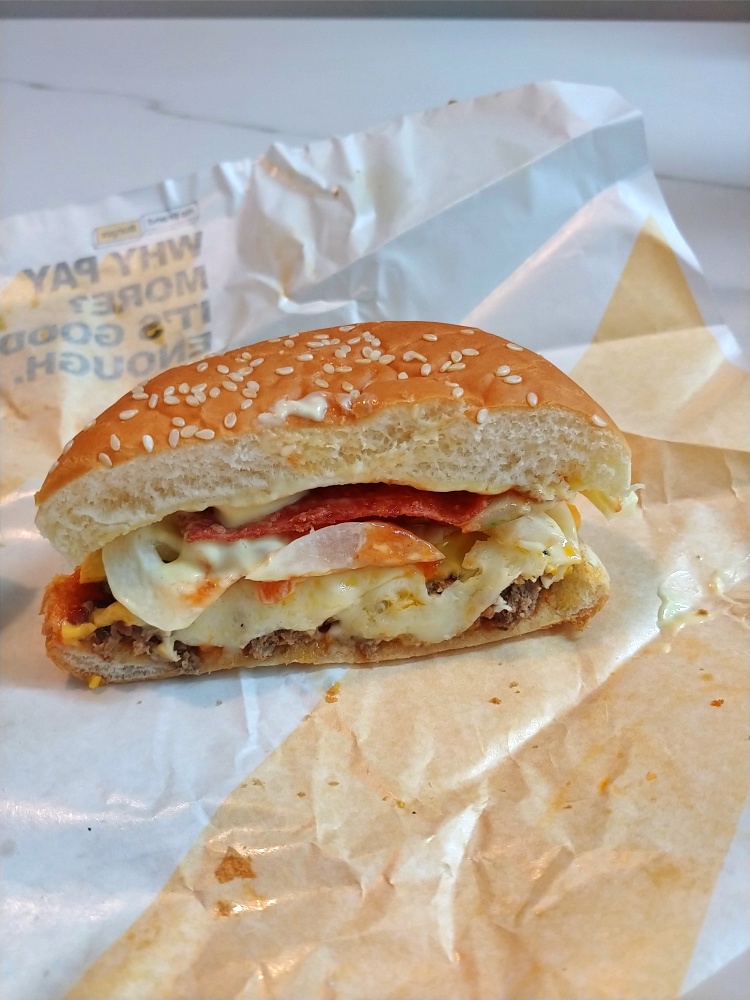 양배추는 없고 소고기 패티, 페퍼로니, 양파가 들어가 있엇습니다. 사진에서는 페퍼로니가 가려서 그렇지 소고기 패티가 꽤나 두꺼운 편이었어요. 빅맥이나 맥도날드 치즈버거에 들어가는 패티에 비해 두꺼운 편이었습니다.